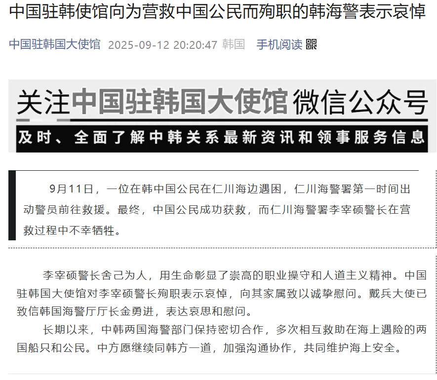 9月11日,一位在韩中国公民在仁川海边遇困,仁川海警署第一时间出动警员前往救援。最终,中国公民成功获救,而仁川海警署李宰硕警长在营救过程中不幸牺牲。