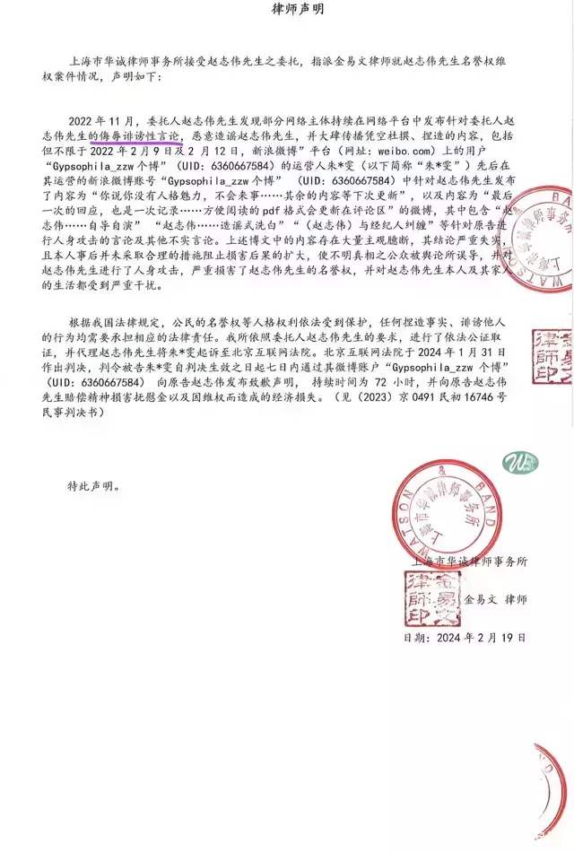 但这些他都不能说,一时间他陷入了两难境地。此后赵志伟就因为出轨的道德瑕疵被钉在了耻辱柱上。然而这还不是是糟糕的,最惨的是负面舆论影响他的资源,一度让他陷入无戏可拍的境地,就连偶遇到认识他的路人,也会戳着脊梁骨骂他。虽然在被冤枉的第一时间,赵志伟就收集证据向司法机关起诉,结果是好的,他赢得了诉讼的胜利,造谣者均已向他公开道歉并赔偿。